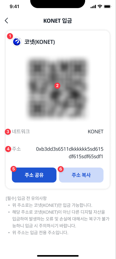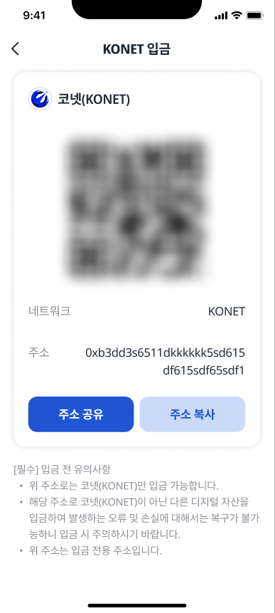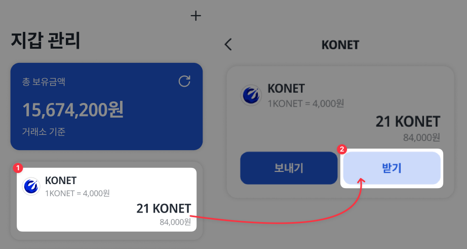 Từ màn hình chính, bạn có thể nạp trực tiếp KONET vào ví. Hãy làm theo hướng dẫn kèm hình ảnh một cách chậm rãi để có thể thực hiện nạp tất cả các tài sản đã được niêm yết trên KONWallet. Nếu bạn muốn nạp các loại coin khác không phải KONET, vui lòng nhấp vào "Quản lý Ví" ở thanh điều hướng phía dưới.