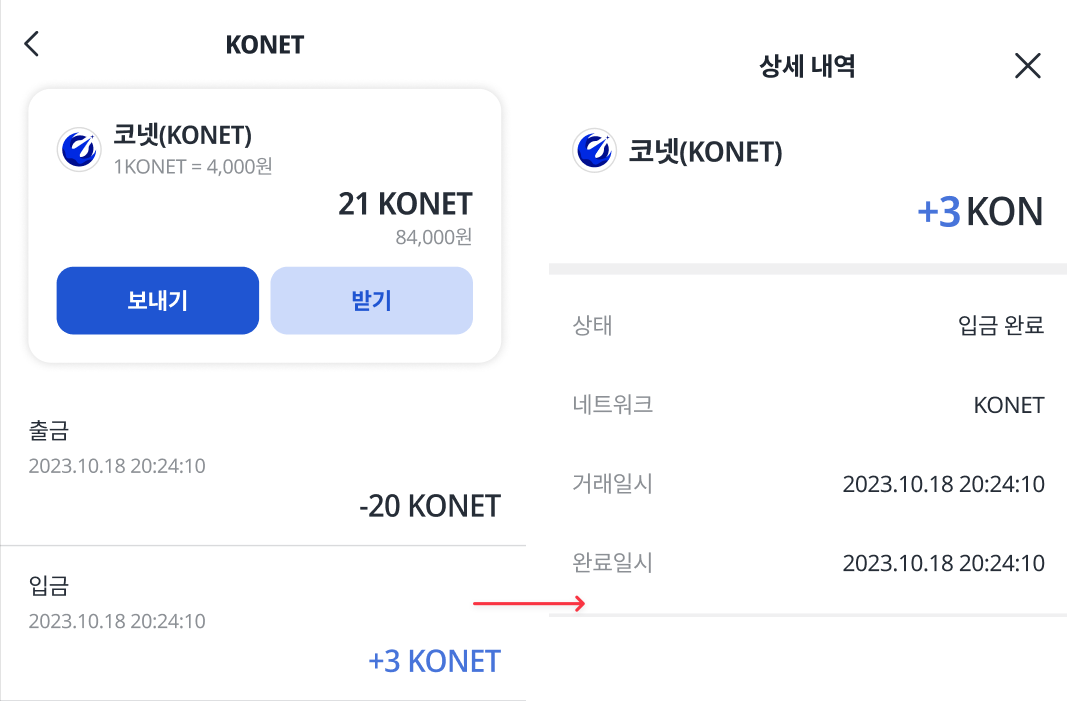 Nhấp vào văn bản trong mục TXID để xem thông tin giao dịch tương ứng trên KONET Explorer.